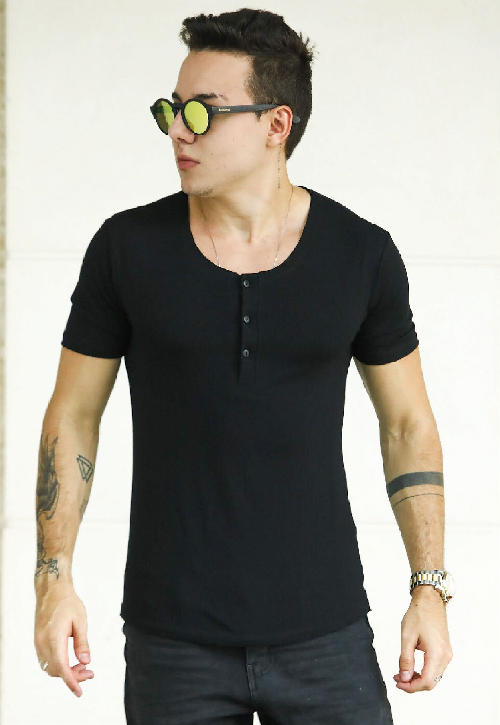 Dennis usando P com 1,76 de altura e 70kg.