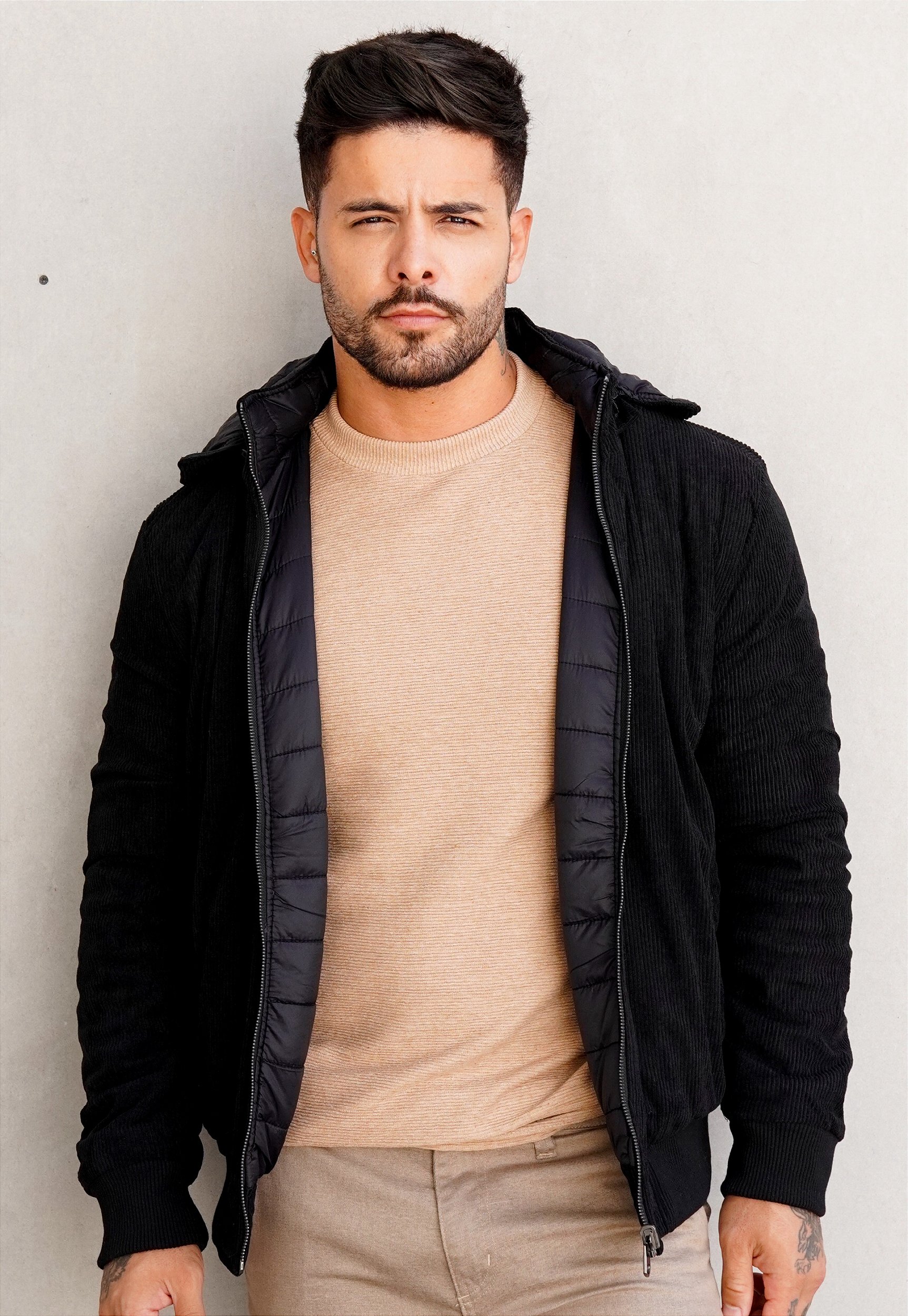 O encontro entre o nylon e o veludo cotelê cria uma jaqueta masculina única — com um lado em nylon e o outro em veludo cotelê.
